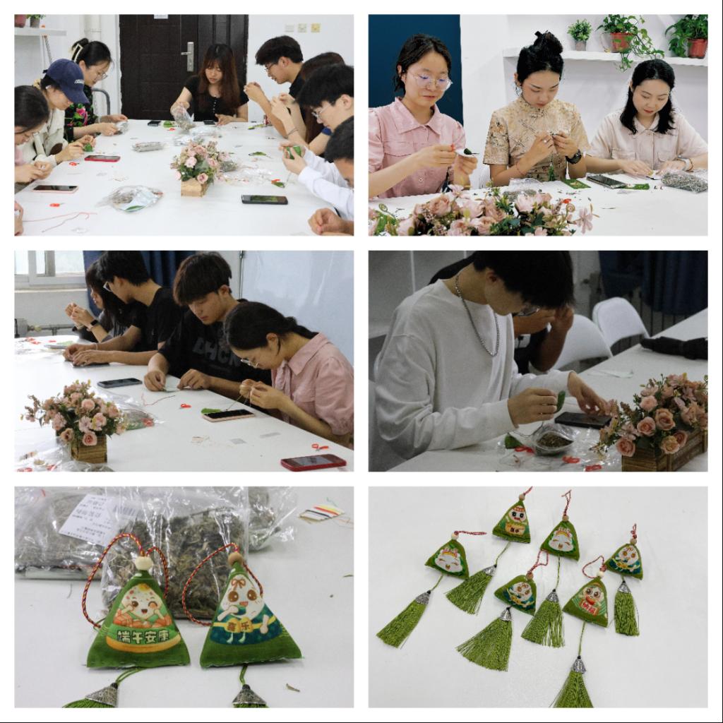 工作人员为大家介绍了端午节的由来以及习俗,耐心讲解了制作香囊的传统及方法。参与师生充分发挥动手能力,用艾草、中药香料、麻布、五彩纱线以及各种配件,有条不紊地按照步骤亲手缝制香囊。从穿针引线到填充香料再到钉穗收尾,大家互相分享着制作香囊的经验,一针一线,一个个独一无二、精致饱满的香囊呈现在眼前。在沉浸式体验香囊制作的过程中,同学们不仅收获了传统手工艺的乐趣,传承了香包制作的传统习俗,更感悟到中华传统文化的魅力。