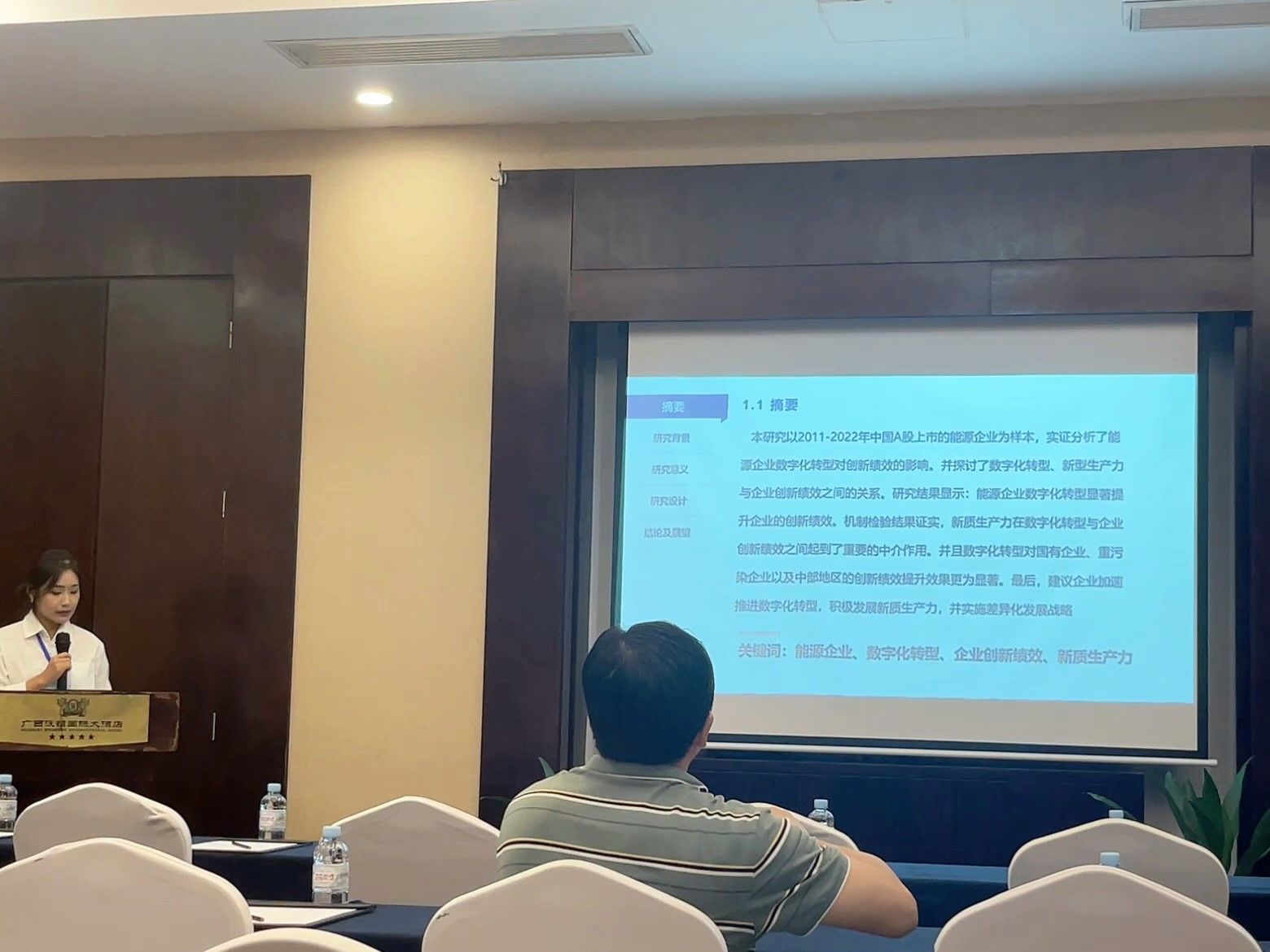 张明同学作了题为《能源企业数字化转型与企业创新绩效—基于新质生产力的调节作用》 的专题报告。该报告介绍了能源企业数字化转型与企业创新绩效之间的关系,以A股上市能源企业为研究对象,实证分析了能源企业数字化转型对创新绩效的影响。
