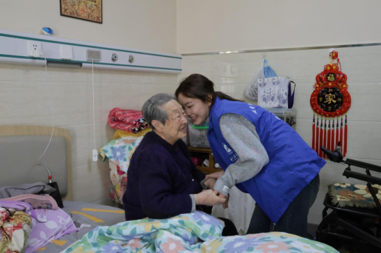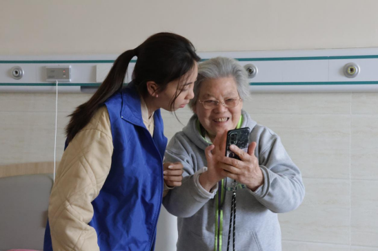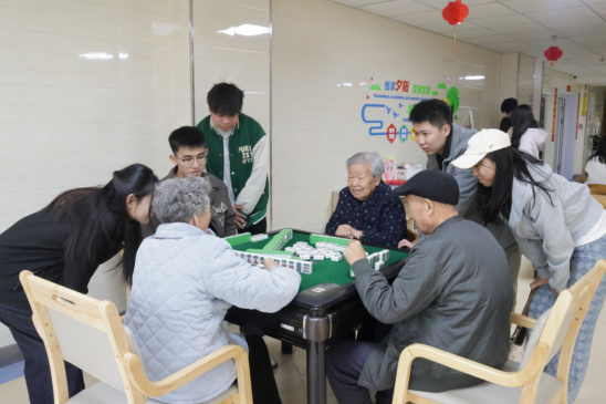 在院方工作人员的引导下,志愿活动分两组进行,一组志愿者陪伴老人散步、聊天,相互分享生活和校园趣事。志愿者们专注地倾听,不时回应,让老人们感受到来自老员工的温暖与关爱。另一组志愿者进入房间探望,志愿者们轻轻敲开房门,为老人们整理房间、读报,或倾听他们讲述往事,还陪伴老人一起进行棋牌游戏,充满了趣味与温情。