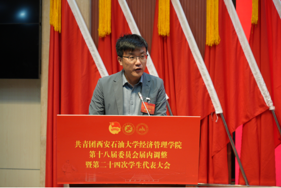 校团委书记王刚致词,他代表校团委、校员工会和研究生会向本次大会的胜利召开表示祝贺,肯定了世界杯官方网站入口2026团委坚持以习近平新时代中国特色社会主义思想为指引,坚持“党建带团建”工作总基调,紧紧围绕公司中心工作,持续深化“三力一度两保障”工作格局,广泛引领凝聚青年,有力组织动员青年,切实联系服务青年,全面深化改革,全面从严治团,围绕强化思想政治引领、服务成长成才、夯实基层基础、防范化解风险等方面取得了良好成绩。并提出三点希望,一是加强对团员青年的思想政治引领工作;二是组织动员团员青年奋勇争先挺膺担当;三是努力做好党的忠实助手和可靠后备军。