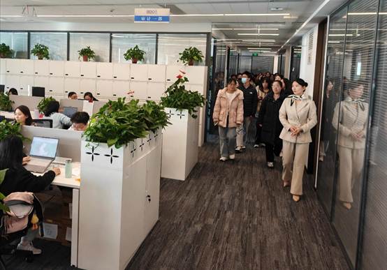 在工作人员引导下,师生一行参观了事务所的审计一部、工程造价部、技术支持部及员工共享空间等。通过实地走访,同学们对事务所的组织架构与业务流程有了更为直观的认识,切身感受到立信严谨专业的工作氛围和以人为本的员工关怀,深刻体会到其团队协作精神与客户服务理念。