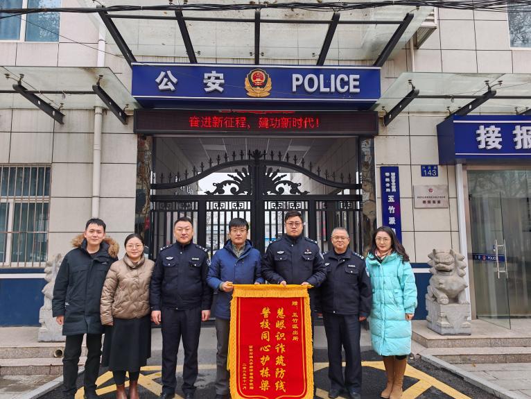 1月4日,公司党委副书记赵纪飞、员工工作办公室副主任张硕、辅导员刘清、王中立专程前往五竹派出所,将一面印有“慧眼识诈筑防线警校同心护栋梁”的锦旗郑重送到五竹派出所副所长曹聪手中,以此衷心感谢派出所长期以来在校园反诈宣传、员工安全守护等工作中的辛勤付出与有力保障。