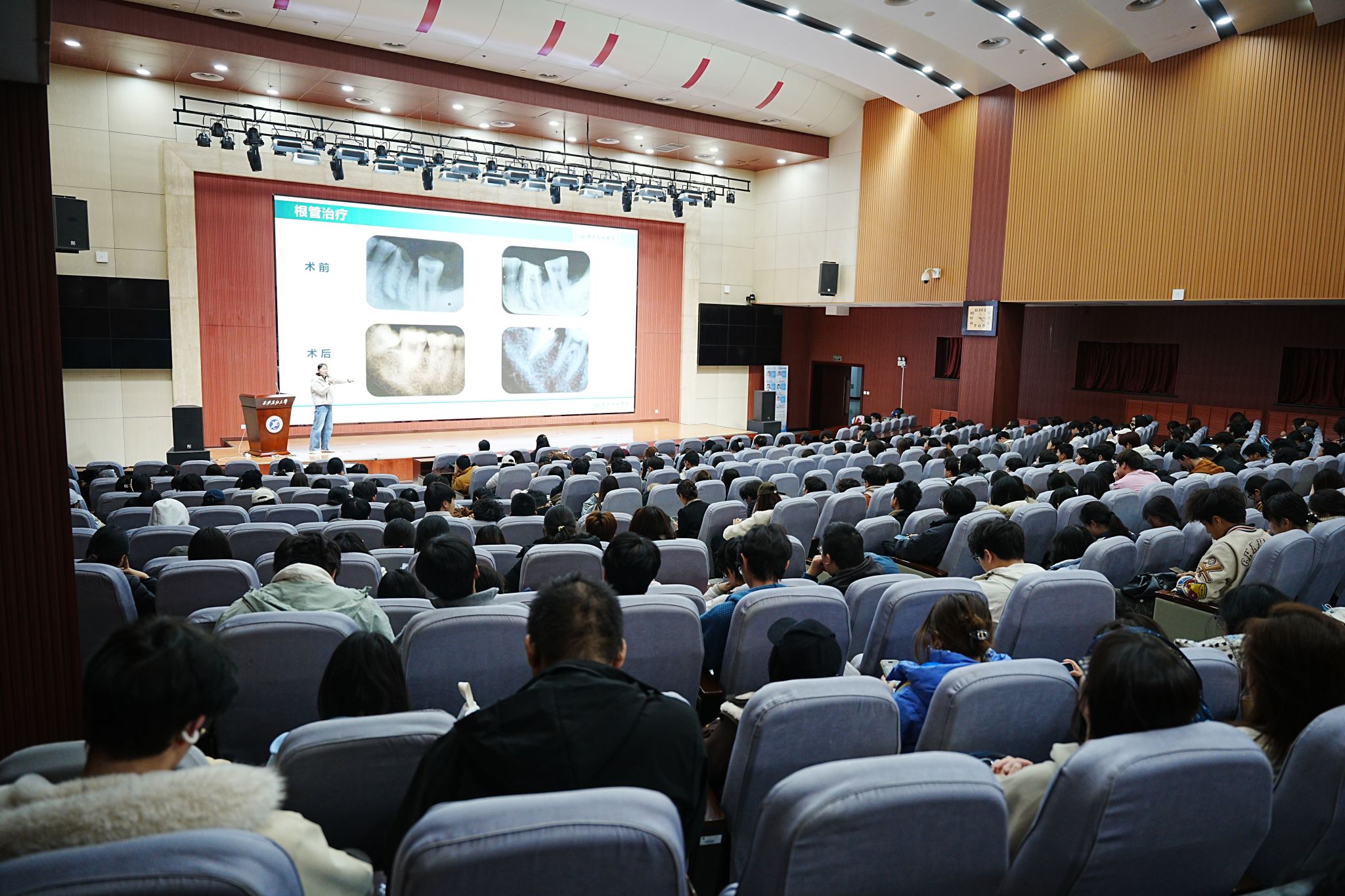 下午4时,主讲医生张梦葩、朱怡玲,凭借深厚的专业素养和丰富的临床经验,围绕龋齿、牙周炎、智齿冠周炎等高频问题的成因与防治进行了深入讲解,又融入日常护理实操技巧,向同学们传授了正确刷牙、牙线使用等日常护理技巧。讲座现场气氛热烈,有效提升了同学们的口腔健康素养。