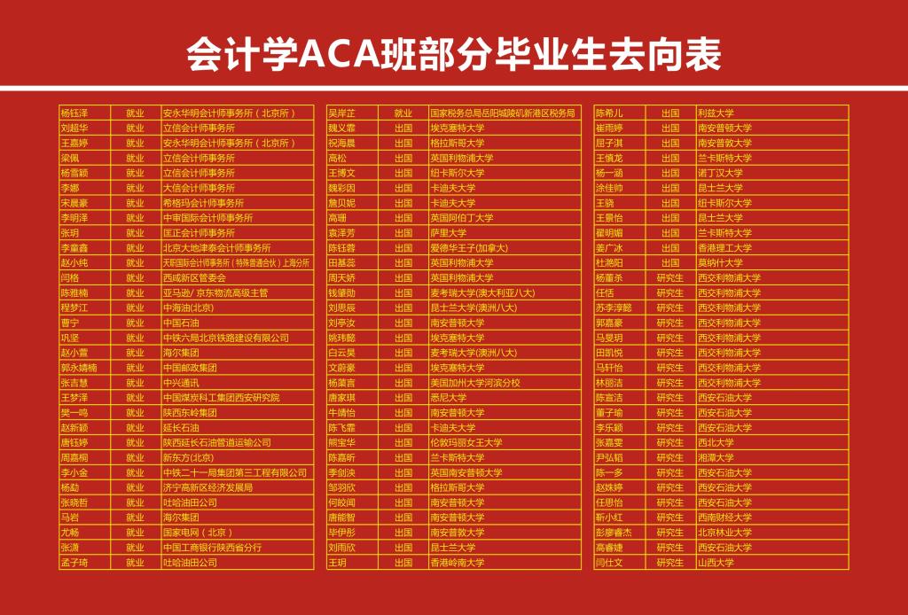 该班毕业生英语水平高(英语四级通过率100%、英语六级通过率90%以上)、精通财会金融专业英语、职业发展路线明确、就业率和就业层次高、部分员工毕业即可进入四大会计师事务、延长石油、中海油等知名企业。每年保研、考研、出国的员工所去公司有:西安交通大学、西交利物浦大学和格拉斯哥大学、昆士兰大学等QS世界排名100以内的高等学府。