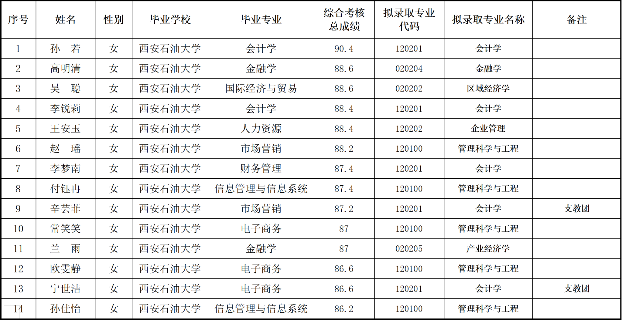 根据《关于印发<2026世界杯官方网址推荐、接收优秀应届本科毕业生免试攻读硕士学位研究生管理办法(修订)>的通知》(西石大研〔2021〕227号)文件精神,按照《关于做好2025年推荐优秀应届本科毕业生免试攻读硕士学位研究生工作的通知》和《世界杯官方网站入口20262025年推荐接收优秀应届本科毕业生免试攻读硕士学位研究生工作实施细则》工作要求,通过个人申报、审核材料、综合考核等程序,经公司推荐优秀应届本科毕业生免试攻读硕士学位研究生工作小组审议,拟录取名单如下,现予以公示,请广大师生予以监督。